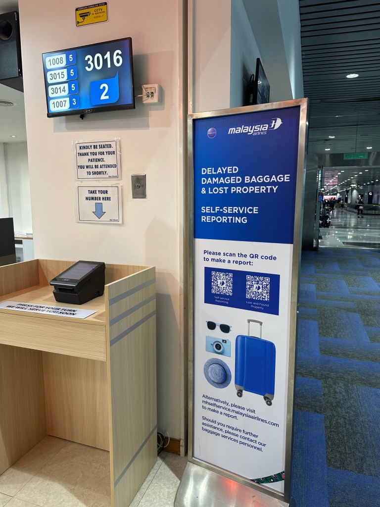 Upon disembarking, an airline staff already surrounded by passengers with inquiries was handing out vouchers and giving “instructions” as to what to do. She told us our flight will be the next day at 7:00 pm and that we are provided food and hotel room! We were so disappointed. Communication was very challenging with her and she was giving us confusing instructions. So we went to stand in line in the immigrationqueue and the unsmiling female officer told us “one at a time”, Trini explained our predicament and she pointed to an area so we can complete the MDAC (Malaysia Digital Arrival Card), which the lady from the airline failed to explain. So we tried to do that but the area was congested with passengers doing the same thing. Trini approached a Tourism booth with several guys “twirling their thumbs“. One of them grudgingly told me to use my cell phone and gave me the website. I’m not very good completing complicated questionnaires in my cell phone so I asked the other guy if he can help. He took our passports and asked me a few personal data and after a couple of minutes told me to open my e-mail. Voila! MDAC form completed! Again, they point you to a general area but doesn’t explain exactly what to do. We saw a uniformed young man standing near the turnstiles who finally told us to scan our passports.