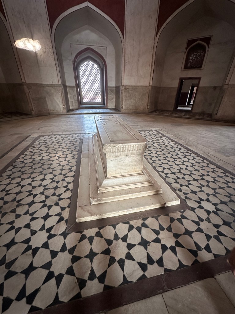 Our tour guide, Ravi, and driver Sunil picked us up at 9:30 am and since we already lost one day (we missed the connecting flight in Kuala Lumpur) it was an abbreviated tour itinerary. Still reeling from lack of sleep and the long flight (5 hours), we boarded our private tour vehicle. Our hotel is located in the “new” part of Delhi and we noticed immediately that the traffic was heavily congested. Ravi explained that it was a holiday (last day of celebration from the independence from British rule). We went to visit Hamayun’s Tomb, built by Human’s widow in 1562 and now a World Heritage Site. Built in India-Islamic style architecture it has a diameter of 47 feet at the base and 9 feet top.