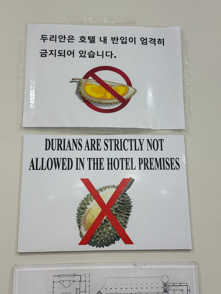 The bulletin board is in KoreanFunny sign, just shows how odorous this tasty fruit is. Durian is a tropical fruit with thorny skin and “smelly” flesh. NILAI SPRINGS RESORT HOTELMost of the resort’s guests are from South Korea who came here to play golfThe hotel staff misting the “kalamansi” tree