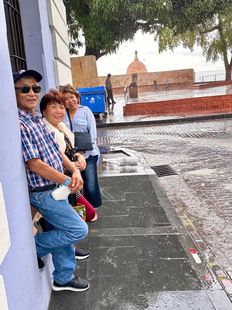 Ruben, our cab driver recommended a restaurant – Barrachina – where we can taste the mofongo.Mofongo is a dish with mashed plantain as its main ingredient and can be ordered with any meats, shrimps, fish or a combination. We ordered the combination. We also ordered refreshing piña coladas. The bartender used Don Q rum which was better than the popular Bacardi. We had a great meal and I noticed Oya getting a little tipsy from the rum so she handed her unfinished cocktail to Tommy. After lunch, we went walking and were barely in the historical site when it started to rain!